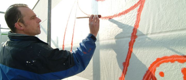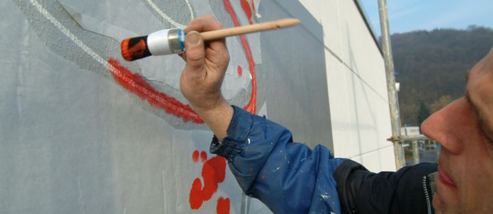 The entire project was realized by painting the designs onto the facade – using the WallMask ASLAN S 41. The highly flexible stencil film ensures sharp contours and can be easily applied onto rough facades. It ideally fits into seams and deepenings and thus prevents paint from running underneath the film.