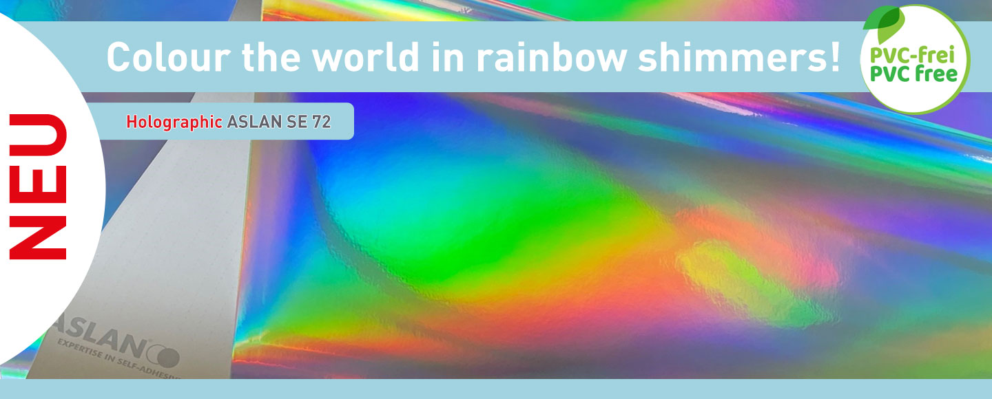 Holographic ASLAN SE 72 is a silver self-adhesive film with an outstanding holographic effect. It’s a 50 µm thick PET-film and shimmers in the colours of the rainbow. The special features of the product include the double-sided effect and the fact that it comes seamless, i.e. without any visible transition of the effect, as is usually the case with such materials. This saves time and material when printing and cutting the product. The film is equipped with a water-based special adhesive from ASLAN and lasts up to 3 years outdoors. The material can be printed with Latex- and UV-curable inks. Holographic ASLAN SE 72 can be applied on smooth, even surfaces and is perfect for use in shop and trade fair construction as well as for visual merchandising. The product is available in the dimensions 1.01 x 25 m.